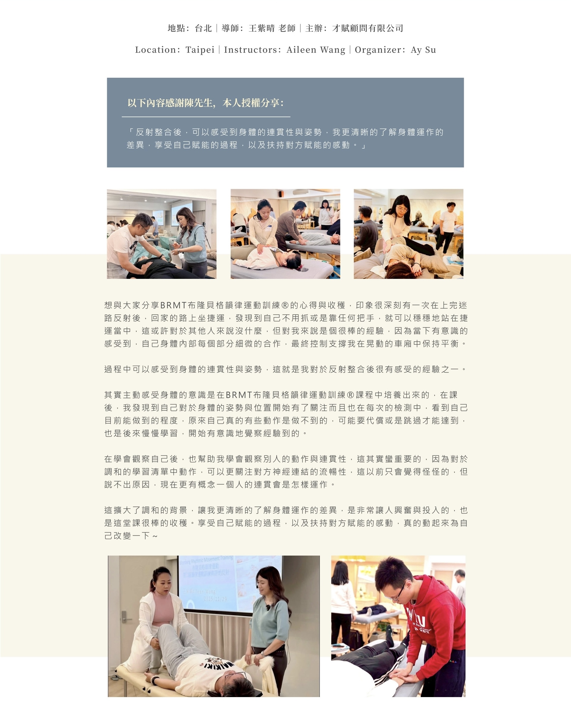 #布隆貝格韻律運動訓練 #原始反射 #情緒調節 #內在領導力 #才賦顧問有限公司 #AySu調和最佳狀態 #王紫晴 #BRMT #Blomberg #AileenWang